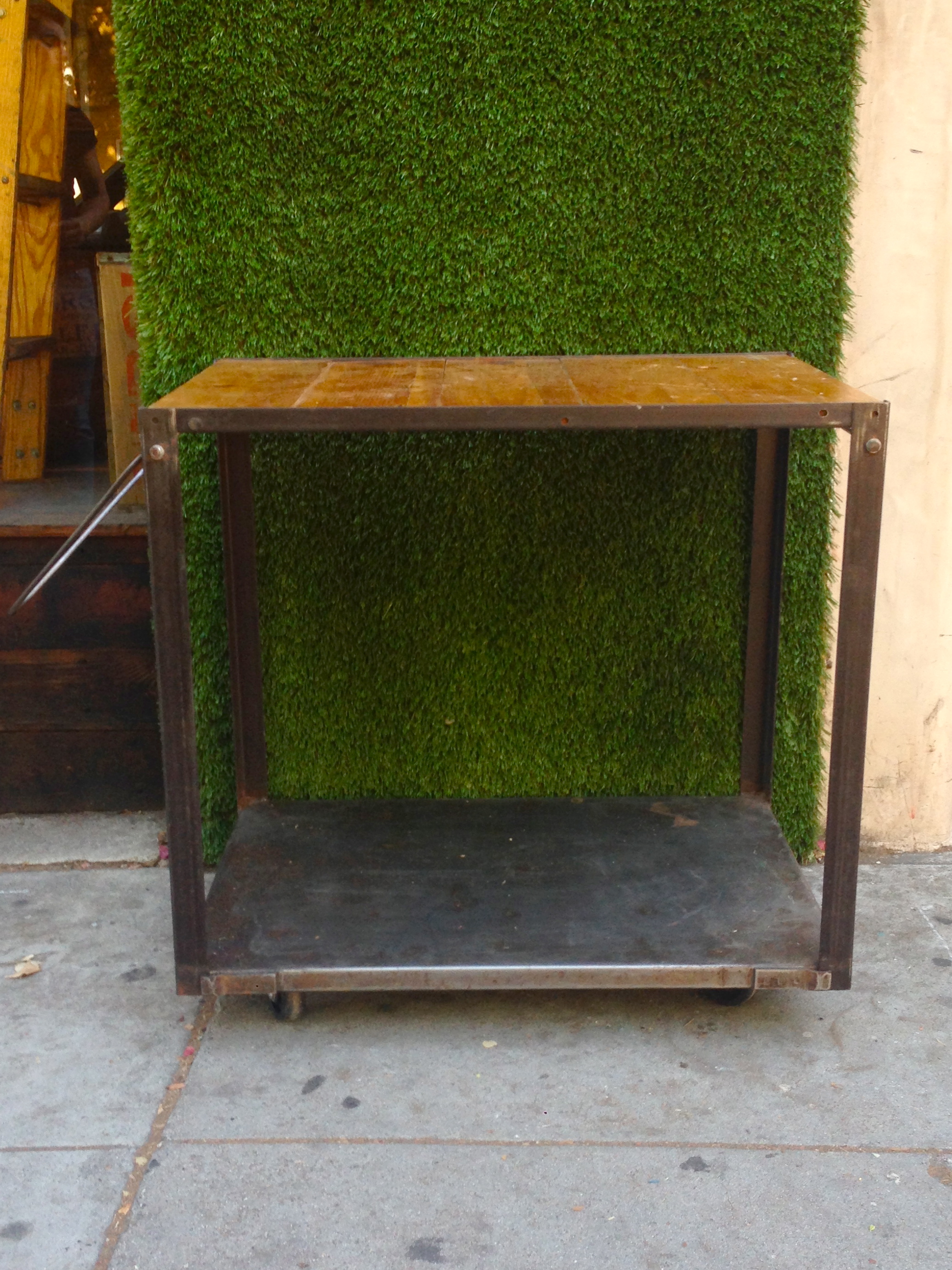 industiral table with casters and wooden top