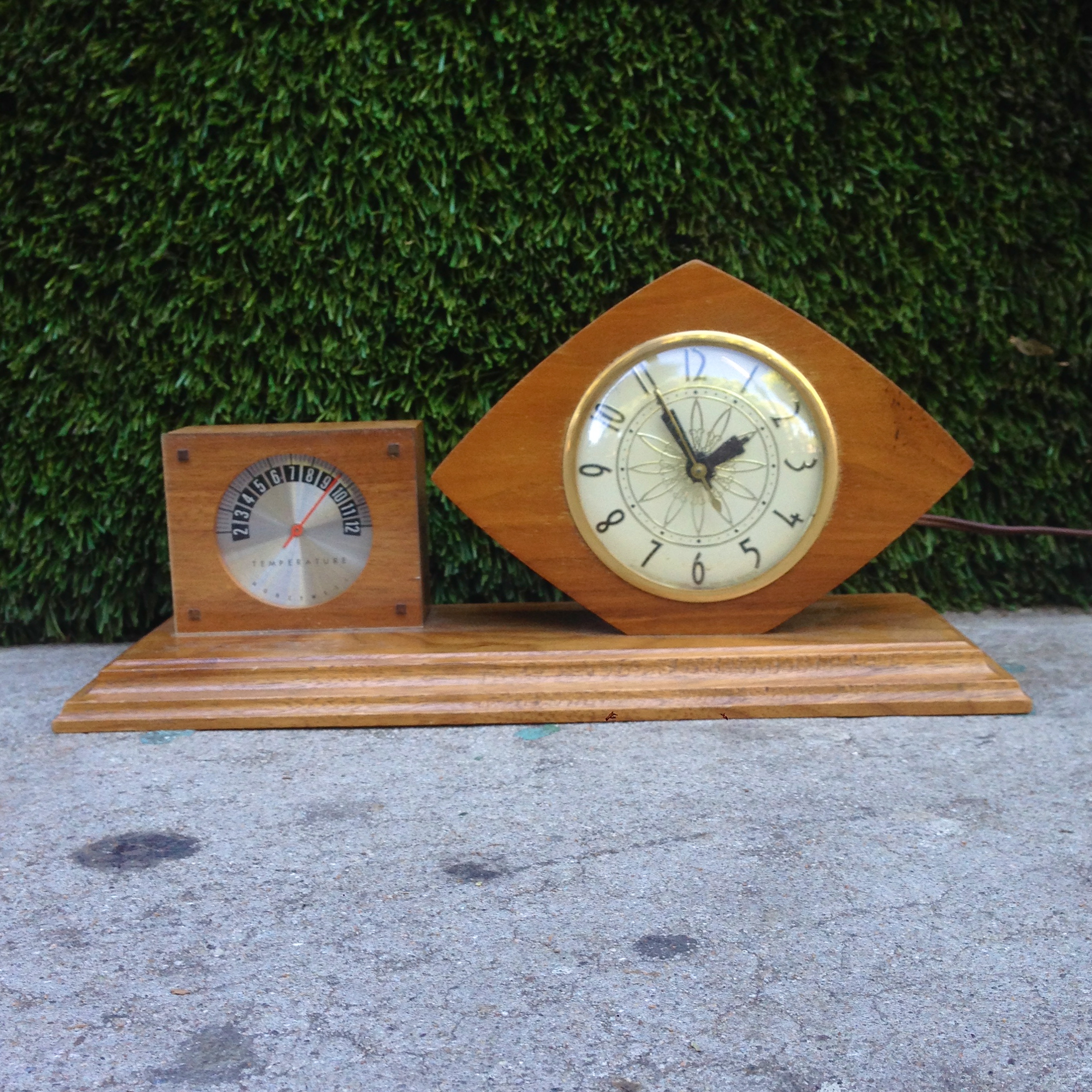 vintage wooden clock and thermometer