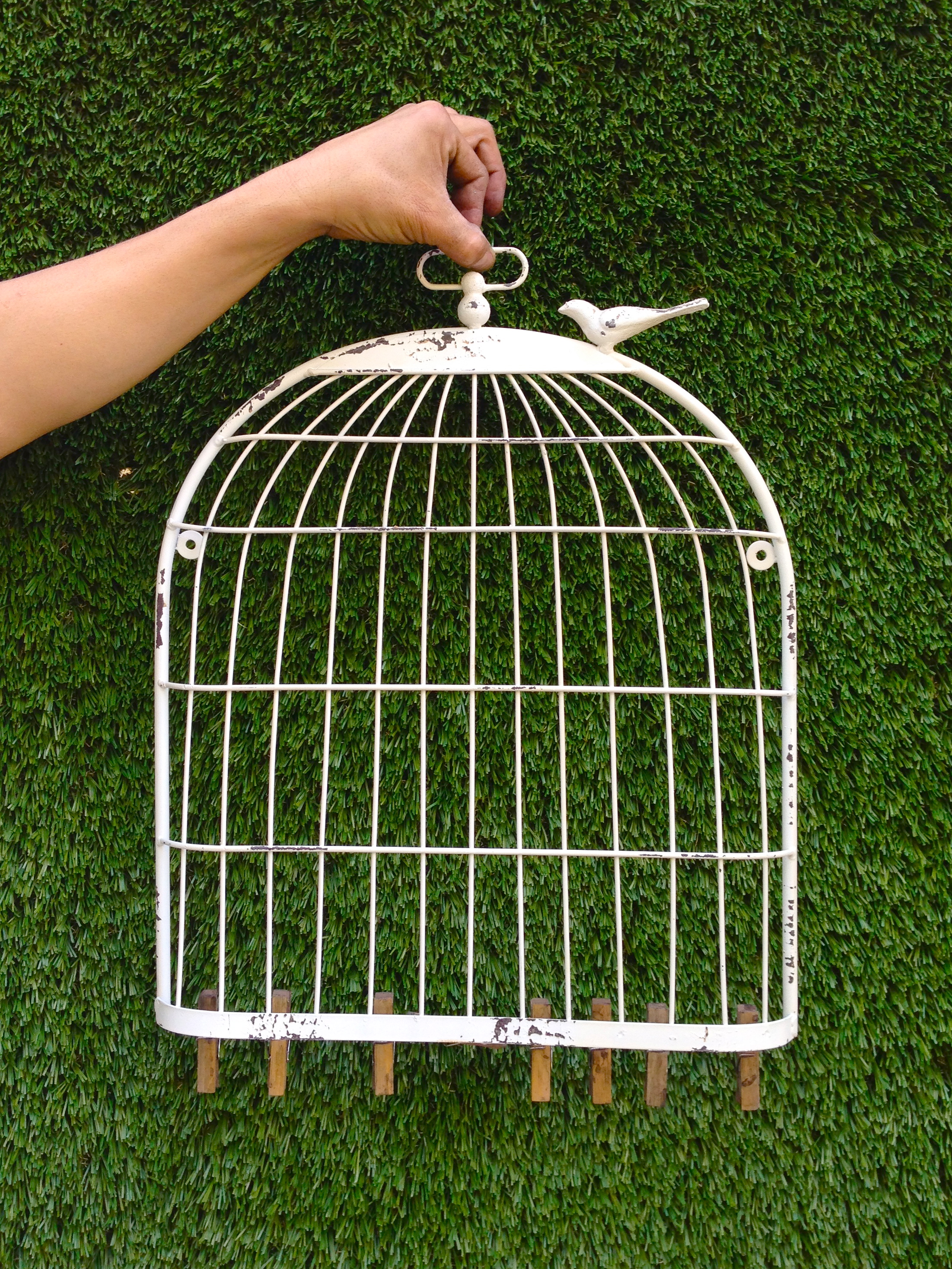 white birdcage wall hanging with wooden clips